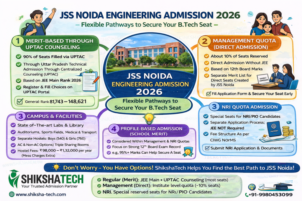 JSS Noida Profile-based Admission (School Merit): Within the management/NRI quotas, JSS Noida also considers the student’s overall profile. This means that high achievers in board exams or other credentials may receive preference. Such profile-based admission 2026 helps reward consistent scholastic performance. For example, a student with near-95% marks in 12th (even with a modest JEE rank) can still secure a seat through this route. ShikshaTech’s counselors emphasize that a strong 12th-grade record can significantly improve chances under JSS’s management quota.